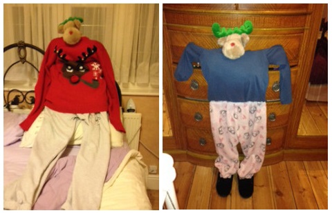 I grabbed Nat’s woolly hat which was at the foot of the bed, and her slippers, and it then appeared that there was a very short person sitting up against the cast iron headboard, wearing only a bra for clothing. A pair of my cheap reading glasses finished off the job, now giving the appearance of a face.